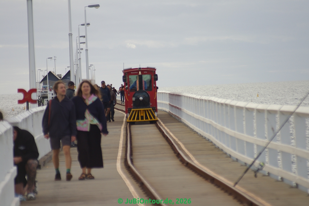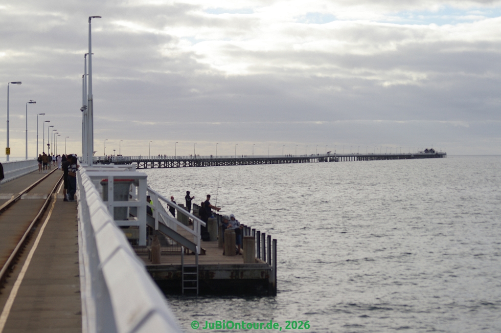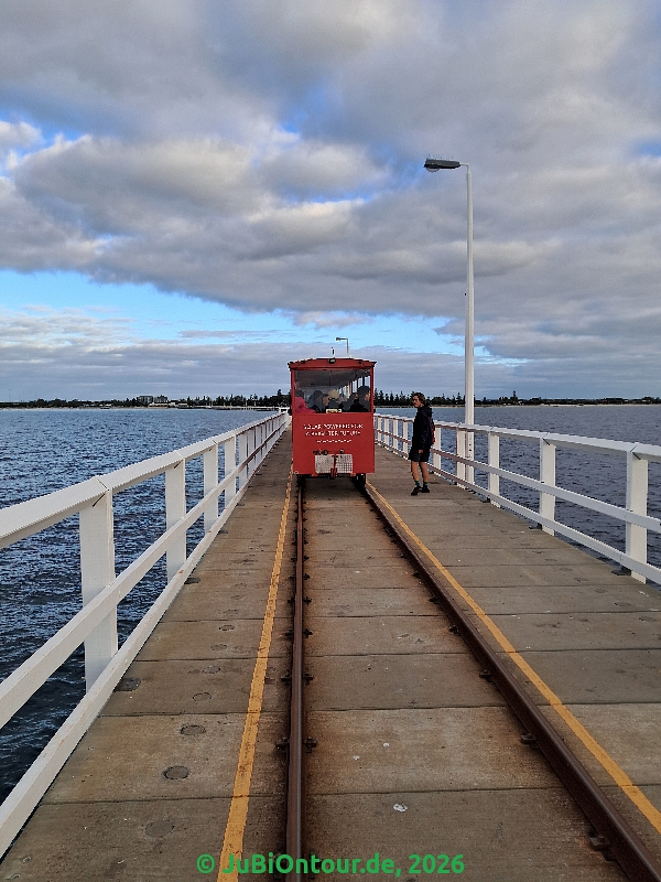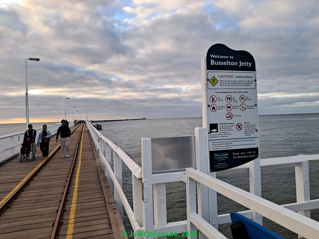 Dort wollten wir gucken ob es noch Karten für eine „Busselton Underwater Observatory“ am Sonntag gibt. Alles ausverkauft, Montag gäbe es noch ein paar Plätze. Dann haben wir erfahren, dass man nach 16 Uhr umme auf die Pier gehen kann 🙂